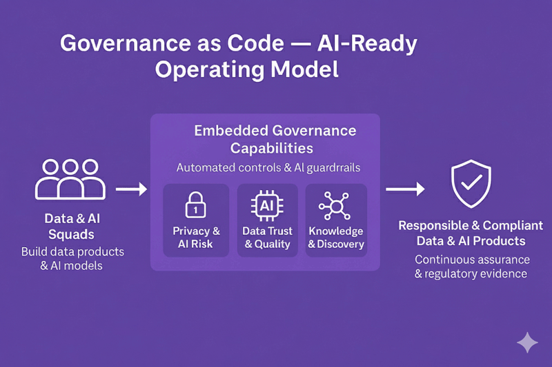 That means moving from a central team writing and checking policy after the fact to an operating model where controls are engineered into the flow of work, assisted by AI, and owned by the people closest to the data and models.’