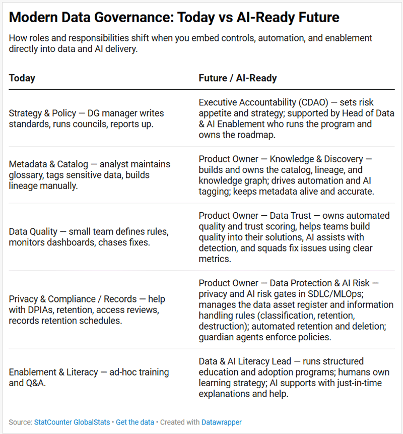 - Delivery moves closer to the work — product owners own specific governance capabilities (quality, protection, discovery) and work directly with squads building data and AI products.